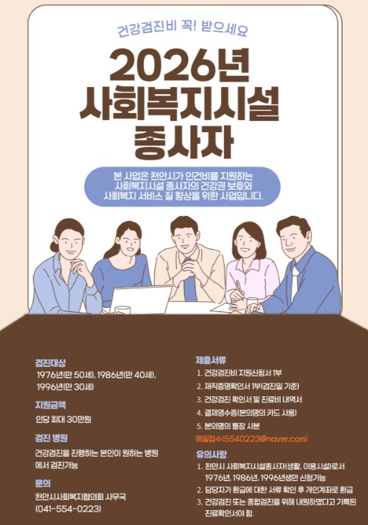 2026년 사회복지시설종사자 건강검진비 지원사업 안내 페이지 정보 작성자작성자 : 천사협 조회조회수 : 580회 작성일작성일 : 26-03-03 15:54 본문 2026년 사회복지시설종사자 건강검진비 지원사업 안내드립니다. 첨부파일 건강검진비 지원 신청서2026년 최신본.hwp (20.5K) 27회 다운로드 목록 이전글-사회복지시설 종사자 처우개선을 위한 '시립예술단 연계 문화·예술공연 관람' 지원 계획 26.03.16 다음글2026년 예산서 공고 25.12.31