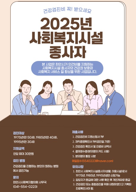 2025년 사회복지시설종사자 건강검진비 지원사업 안내 페이지 정보 작성자작성자 : 천사협 조회조회수 : 5,634회 작성일작성일 : 25-03-28 14:40 본문 2025년 시설종사자(생활,이용시설) 건강검진비 지원사업 안내 드립니다. 첨부파일 2025건강검진비지원신청서.hwp (25.5K) 105회 다운로드 | DATE : 2025-03-28 14:42:52 목록 이전글2024년도 천안시사회복지협의회 결산서 및 후원금 수입 및 사용결과보고서 25.03.31 다음글2025년 법인 정기 이사회의(1차) 개최 25.03.11